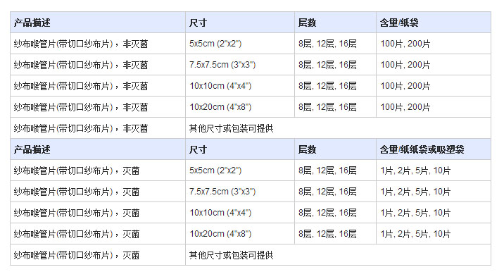 按包(bao)裝(zhuang)可分為普通包(bao)裝(zhuang)和滅菌包(bao)裝(zhuang)。用于(yu)咽(yan)喉部手術(shu)時(shi)固定導管(guan)、覆(fu)蓋或吸(xi)收輕(qing)微(wei)傷(shang)口(kou)的(de)滲出液等。滅菌后(hou)可用于(yu)吸(xi)收傷(shang)口(kou)滲出液。