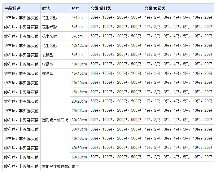 產品規格形狀多(duo)樣,分為帶(dai)X線或(huo)不(bu)帶(dai)X線,帶(dai)橡筋或(huo)不(bu)帶(dai)橡筋,按包(bao)裝(zhuang)可分為普通包(bao)裝(zhuang)和滅菌(jun)包(bao)裝(zhuang)。產品用(yong)于一(yi)般(ban)擦拭和皮膚消毒。滅菌(jun)后可用(yong)于吸收(shou)傷(shang)口滲出液和止血。
