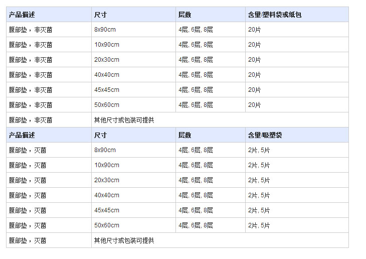 產品規格(ge)多樣,分(fen)為帶棉帶和不帶棉帶;帶X線或(huo)(huo)鋇片和不帶X線或(huo)(huo)鋇片,水洗(xi)和非水洗(xi),按(an)(an)顏色可(ke)分(fen)為白色、綠色和藍色,按(an)(an)包(bao)裝可(ke)分(fen)為普通包(bao)裝和滅菌包(bao)裝。主要用作吸(xi)(xi)收傷(shang)口滲出(chu)液(ye),滅菌后可(ke)在手(shou)術過(guo)程中用于吸(xi)(xi)收傷(shang)口滲出(chu)液(ye)和止血。